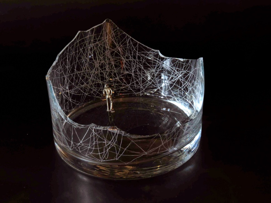 clear cilindric form, scratched, broken edge, 1 silver figur, Ø ca.23 cm