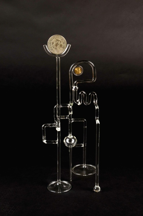 Machtspiel/ Power game an der Lampe frei geformt und montiert, 2 historische Münzen appliziert / free shaped at lamp and 2 historical coins applied, 20 x20 x 35; 2014;